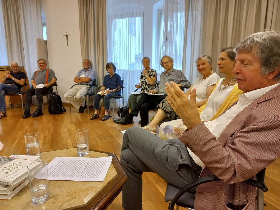 Dementsprechend groß war die Spannung unter den Teilnehmenden des Seminars am Mittwoch, 19.06.2024, – besonders auf das Neue in dem frisch im renommierten Herder-Verlag erschienenen Buch. Gleich vorweg betont der als durchaus kritisch denkend bekannte Theologe seine Intention: Er möchte den Menschen von heute „die Gestalt und Botschaft Jesu möglichst wortgetreu am biblischen Original, liebevoll und freimütig nahebringen“. Hervorgehoben wird von ihm – ein bemerkenswertes Novum, auch angeführt auf der Buchrückseite: „liebevoll“. Denn: „Streitigkeiten können wir uns in unserer Situation nicht leisten.“ In der aktuellen Kirchenkrise sieht Trummer aber zweifellos auch eine Chance, nämlich die einer Neubesinnung auf das Christliche, grundlegend Jesuanische, und weist auf die Bedeutung der Sprache hin. Diese hat gerade in Glaubensdingen für alle, besonders aber für ,Nicht-Insider‘, verständlich zu sein.