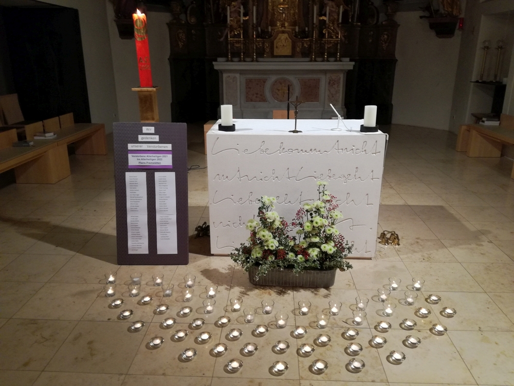 Beim Allerseelengottesdienst gedachten wir all unserer Verstorbenen. Für die im letzten Jahr Verstorbenen unserer Pfarre, deren Namen nochmals vorgelesen wurden,  brannten 59 Teelichter. Die 60. Kerze wurde für alle ungenannten Verstorbenen entzündet. Das „Lichtermeer“ vor dem Altar verweist hoffnungsvoll auf das Licht der Auferstehung für unsere lieben Verstorbenen!
