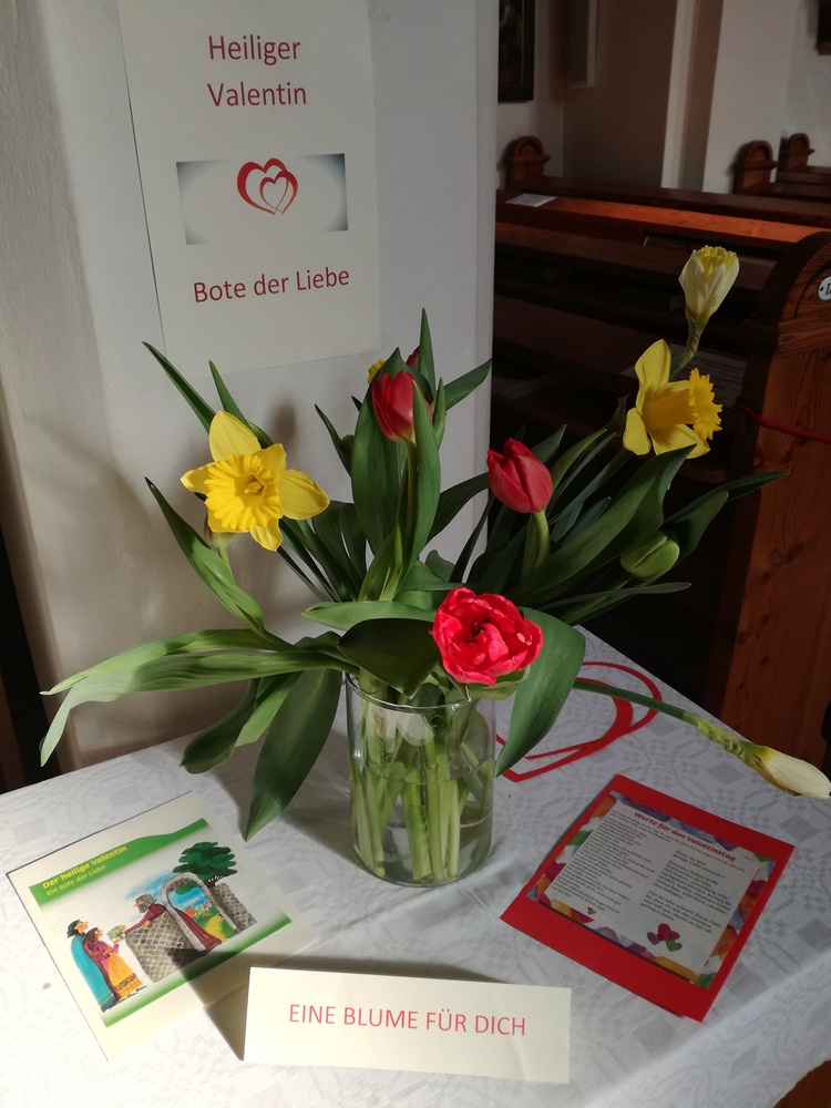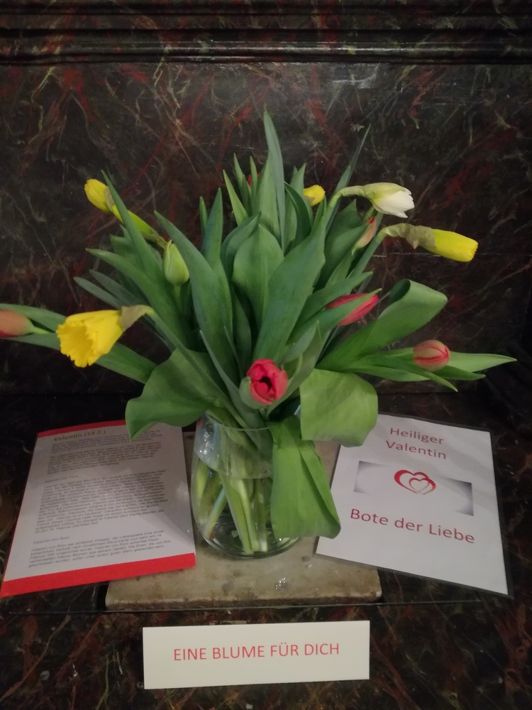 Dazu gab es noch einige Informationen zum heiligen Valentin von Terni, dessen Statue ja auch in unserer Kirche im Altarraum steht. Seine Idee, mit dem Verschenken von Blumen  lieben Menschen eine Freude zu bereiten und Zuneigung auszudrücken, ist heute genauso wertvoll wie damals im 3. Jahrhundert.