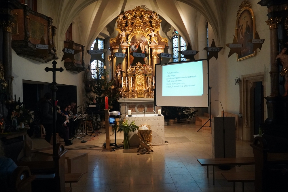 Die Christmette, dieses Mal eine Wort-Gottes-Feier mit Kommunionspendung, feierte Diakon Wolfgang Garber mit uns. In seiner Predigt lud er uns ein, es Weihnachten werden zu lassen, indem wir uns „in die Krippe unseres Nächsten“ legen, d.h. achtsam und einfühlsam mit unseren Mitmenschen umgehen, sodass „Menschwerdung“ erfahrbar wird. Stimmungsvolle Weihnachtslieder erfüllten die abendliche Kirche und die Herzen.