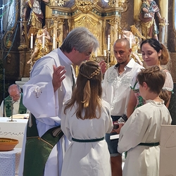 Am Sonntag den 26. Juni haben wir mit den Täuflingen der Corona Zeit einen Familiengottesdienst gefeiert. Die anwesenden Kinder wurden mit frisch gesegnetem Wasser während der Kommunionausteilung zur Erinnerung an ihre Taufe gesegnet. Die beiden Taufbewerber Mehri und Ali aus dem Iran wurden bei diesem Gottesdienst vorgestellt und mit dem Katechumenenöl gesalbt.