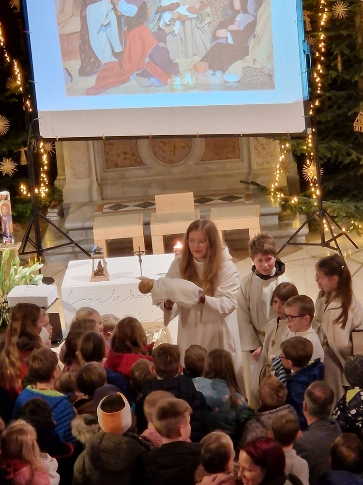 In seiner Predigt sprach Vikar Gerhard von Gott, der als kleines, hilfloses Kind zur Welt gekommen ist, in Armut und Bedürftigkeit. Eine mitgebrachte Windel symbolisiert dies. - Gott ist einer von uns, er kommt uns entgegen. Er ist ein Gott, an den wir uns anlehnen können. Er umarmt uns und stillt unser Verlangen nach Geborgenheit, Liebe und Frieden. …
