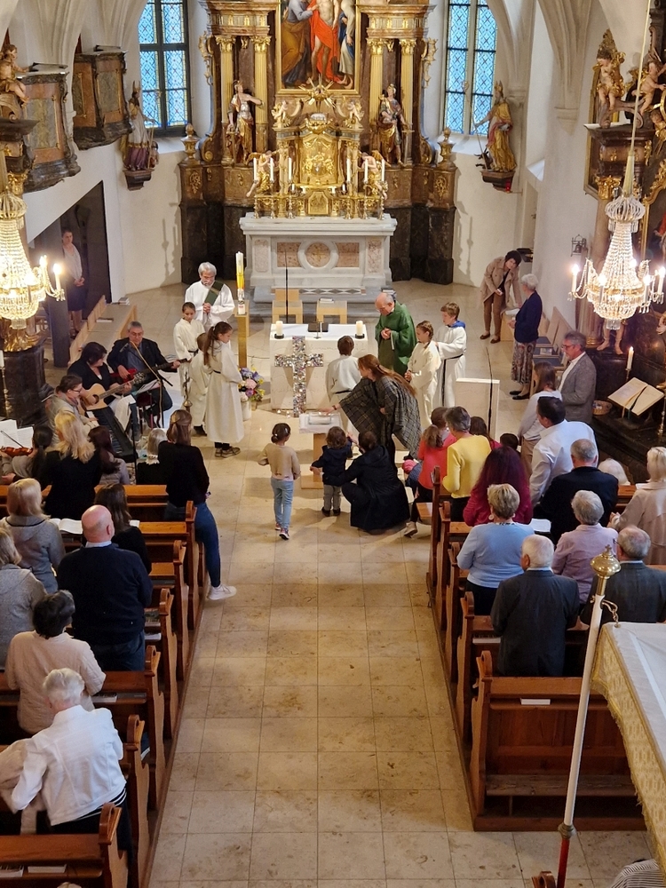 Zelebriert wurde die hl. Messe von Vikar Gerhard Hartmann und Diakon Michi Zepf, der die vielen Kinder zusammen mit den Minis zur Evangeliumsprozession und zum Vater-unser-Kreis einlud – spannende Momente für unsere Kleinen!