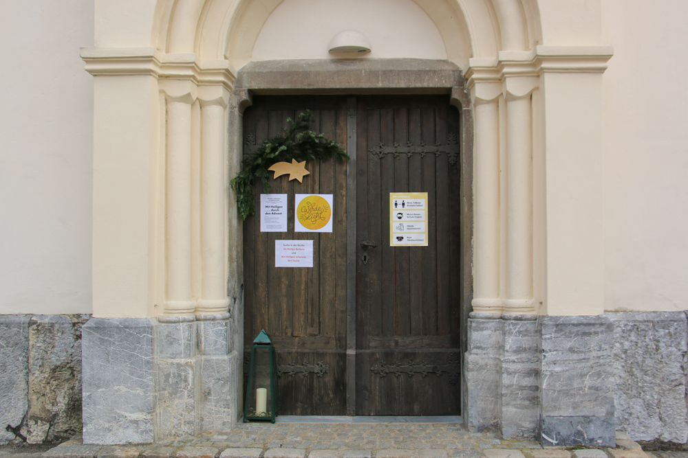 Eingang der Pfarrkirche Dobl am Tag